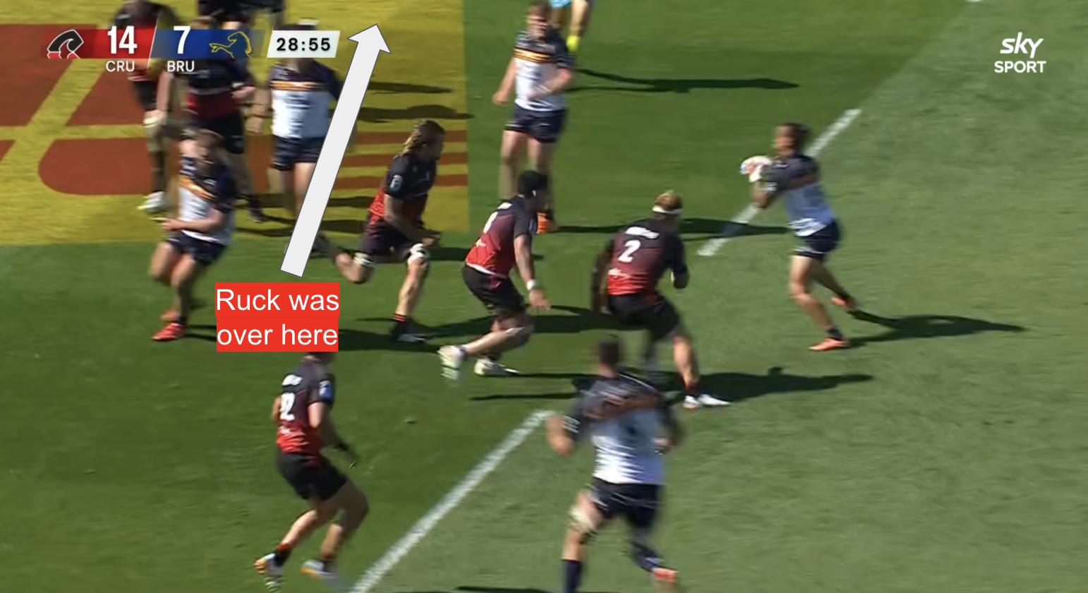 Unlike the Highlanders try, the Crusaders do enough to cut off the pass from Muirhead, with Bell getting into the passing channel, but Muirhead is never looking to pass once the ball is released to him. As soon as van Nek releases the pass, Muirhead props off his left foot and heads back towards where the ruck was. Gardiner drops out of the line to fold around the corner, anticipating that the ball will go wider. This leaves a massive gap between the two props, Newell and Williams, which Muirhead uses his pace to burst through. The Crusaders pack as a whole really struggled to deal with the mismatches the Brumbies were creating, and with their quicker forwards Blackadder and Lio-Willie often being a part of the rush or looking for turnovers at the breakdown, it left their tight five to defend against the Brumbies speedsters on multiple occasions. Newell found himself on the spot twice and was not able to deal with Muirhead’s pace at the line. With the Chiefs coming up next week, I’m sure Damian McKenzie and co will be licking their lips at the prospect of running at some isolated tight five members.