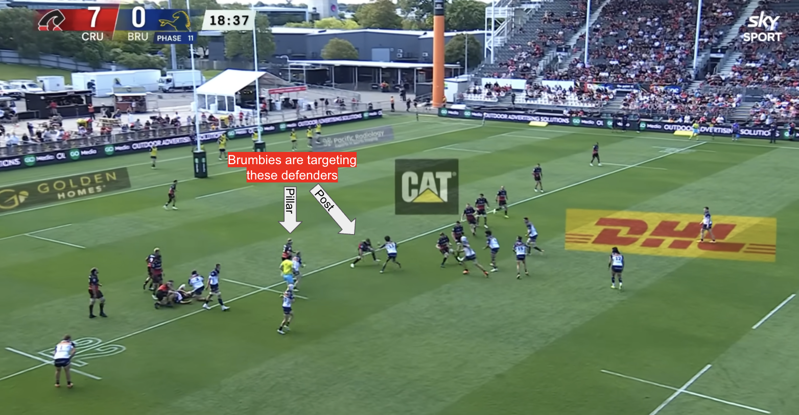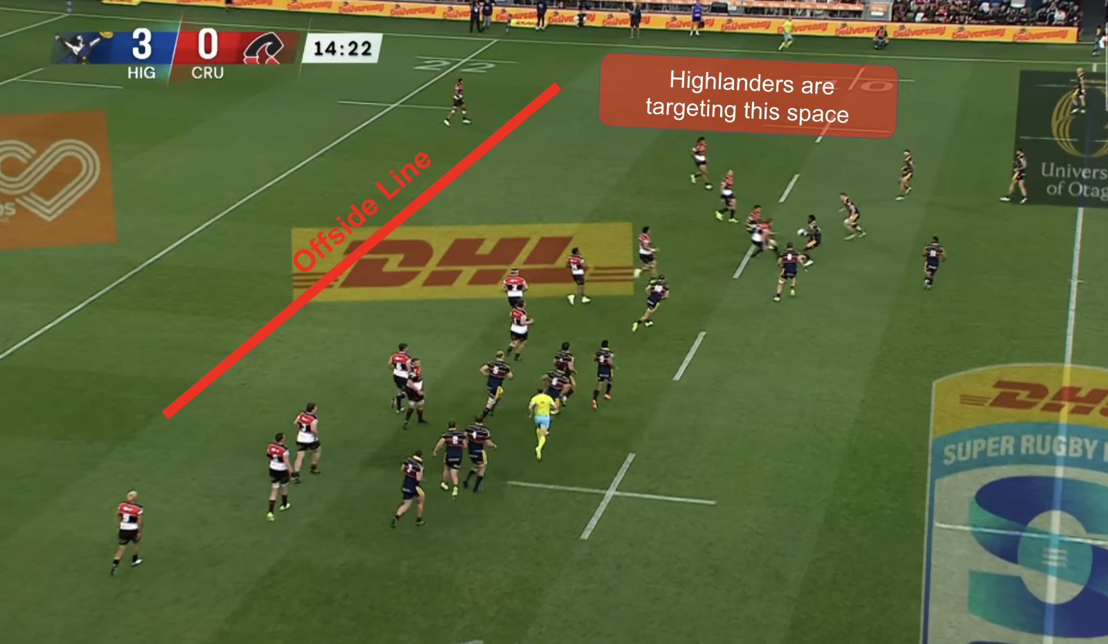 The Crusaders have started 2026 employing a very aggressive rush defence. At times, a similar system was used last season, but not as aggressively as it has looked to start this season. The Highlanders and Brumbies countered the system in two relatively different ways. The Highlanders looked to target space on the outside of the Crusaders defensive line, and the Brumbies targeted space inside closer to the ruck. We’ll start by looking at the Highlanders game.